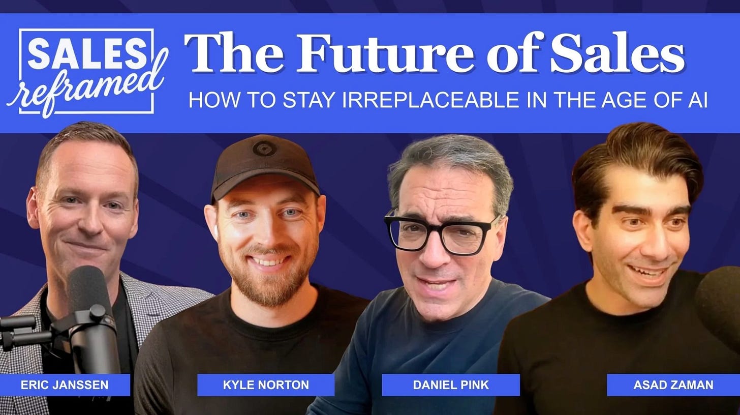 For context: Eric is an entrepreneur turned sales professor at Ivey Business School. He’s built Sales Reframed around this idea that sales is a life skill, not just a job function. For the final episode of the season, he wanted to tackle the future of sales head-on, so he talked to three people coming at it from very different angles. Daniel Pink wrote the literal book on modern selling (To Sell Is Human). Asad Zaman is the CEO of Sales Talent Agency and has spent 15+ years matching sales talent with companies. And I’m in the weeds every day as CRO at Owner.com, building an AI-native sales org approaching $100M ARR.